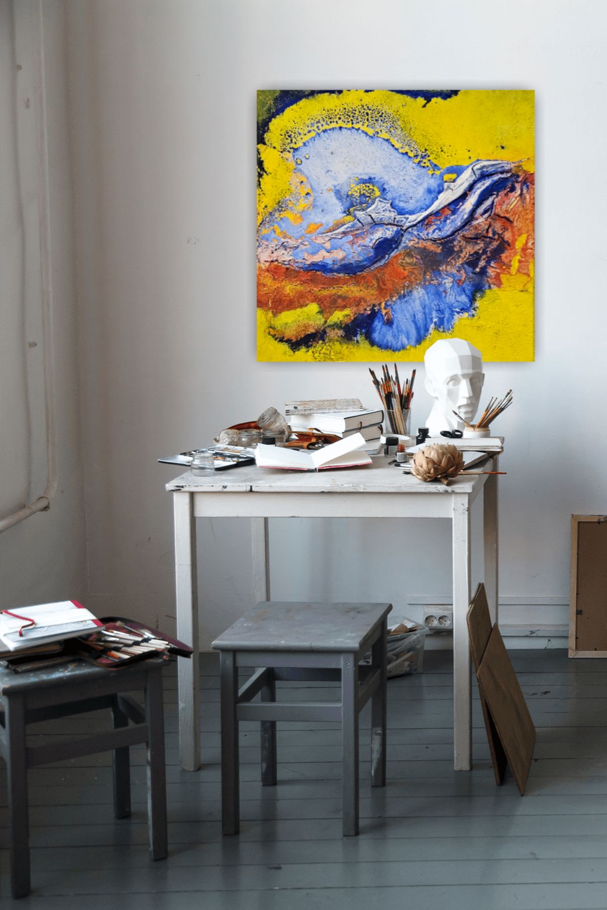 Ich arbeite mit hochpigmentierten Acryl- und Ölfarben und reinen Farbpigmenten.